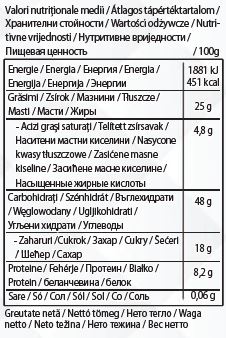 Nu conține agent de dospire. Poate conține urme de ou, lactate (inclusiv lactoză) și fructe în coajă lemnoasă (alune și nuci).