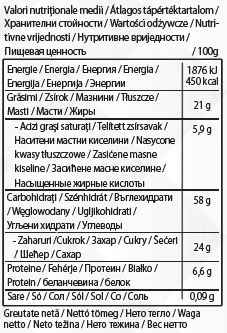 Nu conține agent de dospire. Poate conține urme de ouă, produse lactate (inclusiv lactoză) și fructe în coajă lemnoasă (alune și nuci).