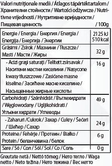 Poate contine urme de oua, produse lactate (inclusiv lactoza) si fructe in coaja lemnoasa (alune si nuci).
