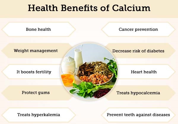 Calciul in cantitate suficienta inseamna sanatatea dintilor si a oaselor, formand structura acestora. Asigura functionarea optima a sistemului cardiovascular, in special bataile regulate ale inimii. Contribuie la transmiterea impulsului nervos si la metabolizarea fierului. S-a constatat ca marirea dozei zilnice de calciu atenueaza durerile menstruale si ca ajuta la prevenirea reactiilor alergice.
