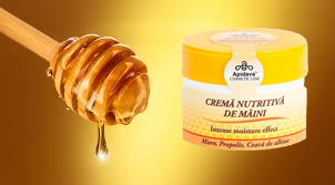 Crema hidratanta cu miere de albine, protejeaza pielea solicitata a mainilor, mentine echilibrul hidric, are actiune emolienta si stimuleaza procesul de vindecare a leziunilor superficiale. Amestecul nutritiv si catifelat se datoreaza poprietatilor hidratante ale mierii la nivel epitelial.