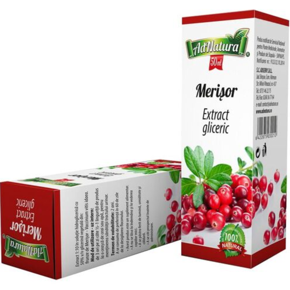 AdNatura Merișor extract glicerinic este o soluție naturală, dedicată susținerii funcțiilor sănătoase ale tractului urinar și menținerii stării de bine generale. Obținut printr-un procedeu de extracție blândă cu glicerină vegetală, acest produs păstrează intacte substanțele active valoroase din fructele de merișor (Vaccinium macrocarpon), recunoscute pentru puternicul lor efect antioxidant și proprietățile diuretice. Fiecare flacon de 50 ml este conceput pentru a oferi o concentrație optimă de principii active, fără adaos de alcool sau zaharuri rafinate, adaptându-se astfel atât adulților, cât și persoanelor care respectă regimuri fără alcool. Glicerina vegetală asigură o bună biodisponibilitate și un gust plăcut, ușor dulceag, facilitând administrarea. Produsul este ambalat în sticluță cu picurător, pentru dozare precisă și igienică, fiind însoțit de instrucțiuni detaliate de utilizare. Merișorul din care se obține extractul este cultivat în mediu controlat, fără utilizarea pesticidelor chimice, iar procesul de fabricație respectă standardele GMP (Good Manufacturing Practice), garantând o calitate superioară. Prin aportul ridicat de proantocianidine și taninuri naturale, acest extract joacă un rol important în prevenirea aderării bacteriilor pe pereții tractului urinar, contribuind la reducerea riscului de infecții urinare și la ameliorarea disconfortului asociat. De asemenea, compușii fenolici prezenți sprijină protejarea celulelor împotriva stresului oxidativ și susțin funcționarea optimă a sistemului imunitar. Formula fără alcool îl face potrivit pentru persoanele sensibile sau cele care evită consumul de etanol, în timp ce absența aditivilor artificiali reflectă angajamentul pentru un stil de viață sănătos și echilibrat. Cu o stabilitate prelungită la temperaturi obișnuite și într-un ambalaj ecologic și reciclabil, acest extract glicerinic de merișor reprezintă o alegere responsabilă pentru cei care își doresc un supliment natural, eficient și sigur.
