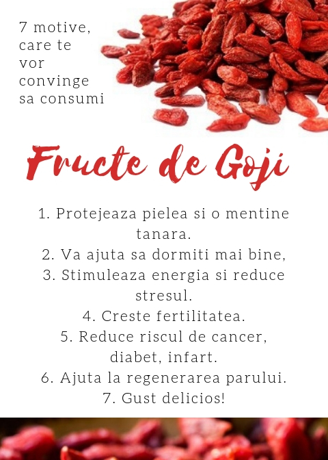 Fructele de goji sunt cele mai sanatoase fructe uscate. Sunt folosite in medicina asiatica de peste 2000 de ani, cunoscandu-se inca de atunci beneficiile ce le aduce sanatatii, energiei si longevitatii. Acestea au putine calorii, nu contin grasimi, sunt o sursa de fibre si antioxidanti. Bneficiile pe care le includ fructele goji sunt abilitatea de a preveni bolile, ajuta la reglarea greutatii si a digestiei. Se poate consuma crud, in forma lichida, de pudra, sau cel mai popular mod este in forma uscata.