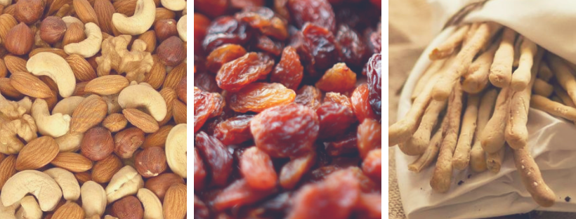 Primul, compus dintr-o varietate de nuci, este bogat in fibre, a doua, compus dintr-o varietate de stafide va va oferi energia necesara, iar grisinele au un avantaj ridicat in ceea ce priveste nutritiile.