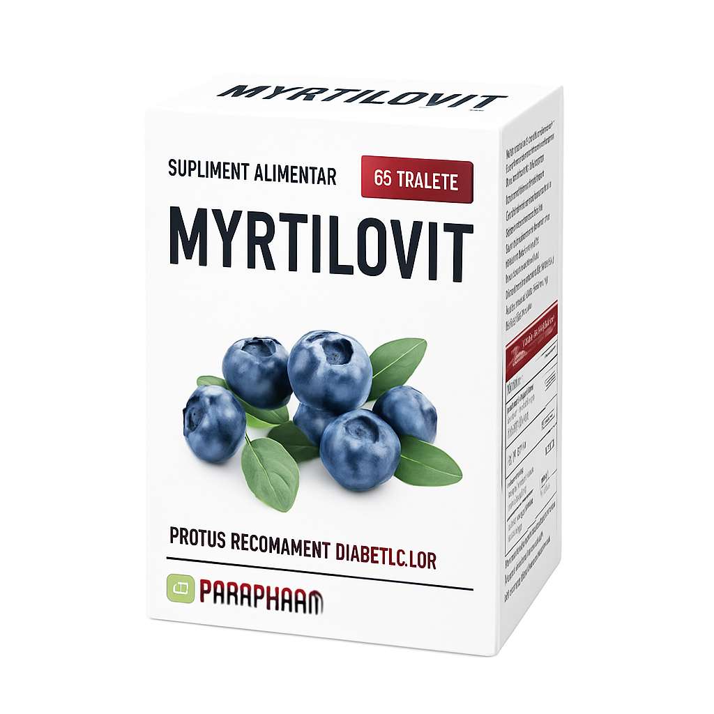 Myrtilovit este un supliment alimentar obtinut din fructe de afine si catina, vitamine, oligominerale si un prebiotic (fructooligozaharide).