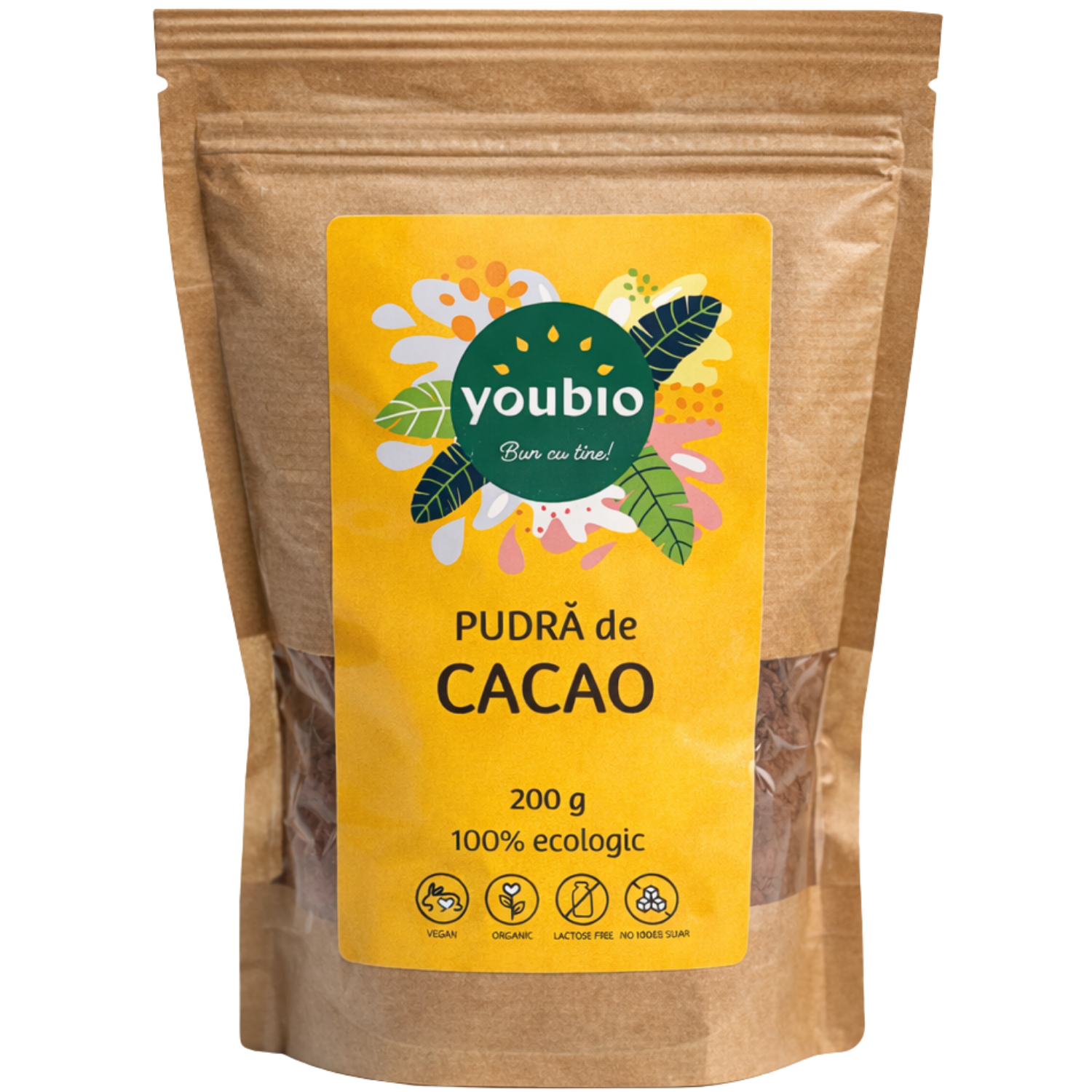 Pudra de cacao Youbio, ambalată într-un plic de 200 g, este alegerea ideală pentru toţi cei care îşi doresc gustul intens şi autentic al boabelor de cacao, fără adaosuri artificiale. Obţinută exclusiv prin procesare blândă, păstrează toate aromele naturale şi substanţele nutritive esenţiale, fiind potrivită atât în preparatele culinare, cât şi în cele de cofetărie. Formula 100% ecologică garantează că fiecare linguriţă de cacao provine din culturi certificate organic, fără pesticide sau fertilizanţi chimici, oferind un produs responsabil faţă de mediu şi sănătate.
